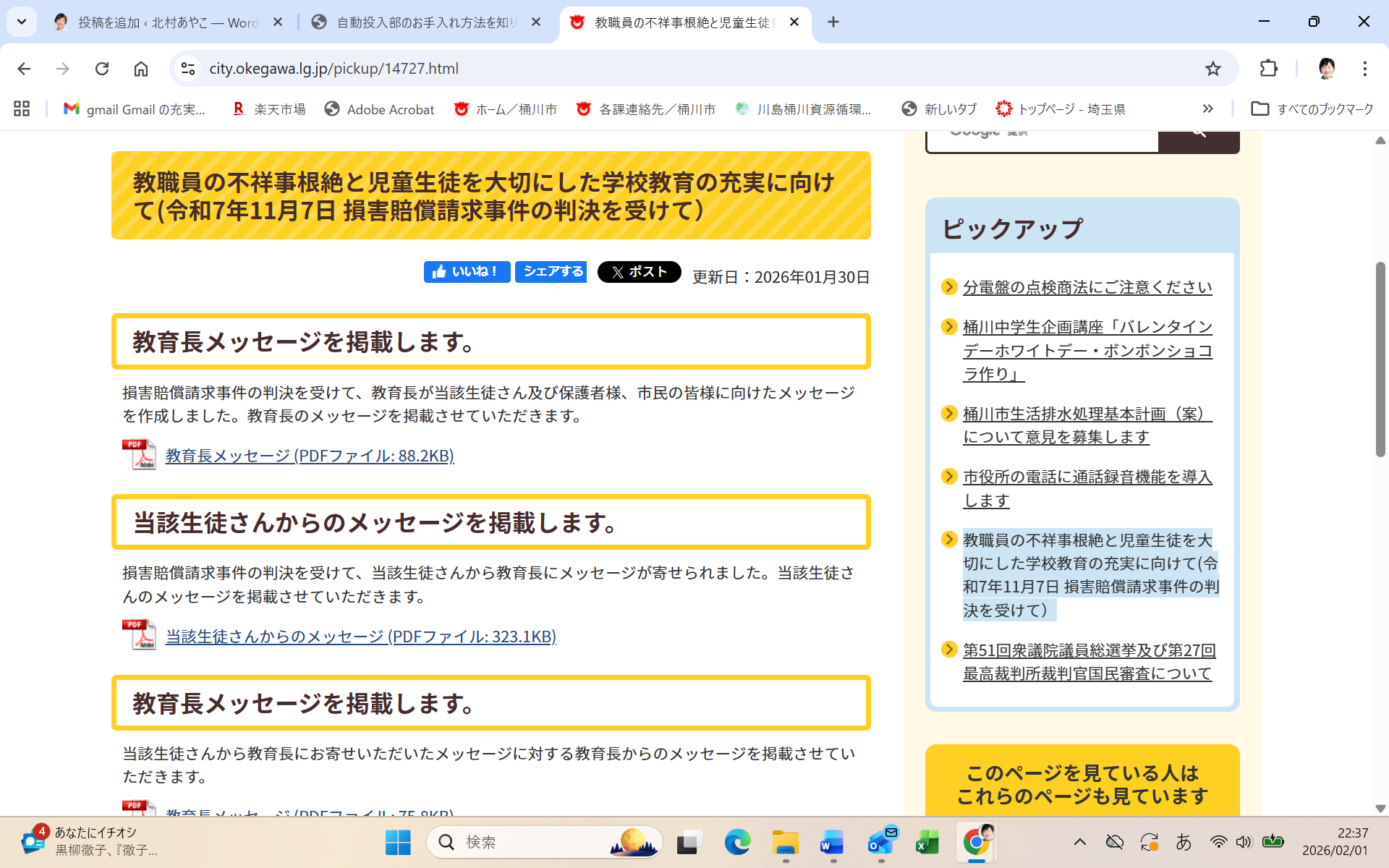 教職員の不祥事根絶と児童生徒を大切にした学校教育の充実に向けて(令和7年11月7日 損害賠償請求事件の判決... 損害賠償請求事件の判決を受けて、教育長が当該生徒さん及び保護者様、市民の皆様に向けたメッセージを作成しました。教育長のメッセージを掲載させていただきます。